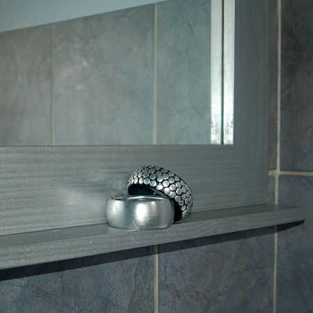 El espejo fue rociado con Rust-Oleum Universal - plateado titanio - que ata en maravillosamente con la nueva whisper paredes grises. El nuevo color hace el cuarto de baño parezca mucho más brillante, y con pintura mate disfraza el final horrible de yeso en las paredes.