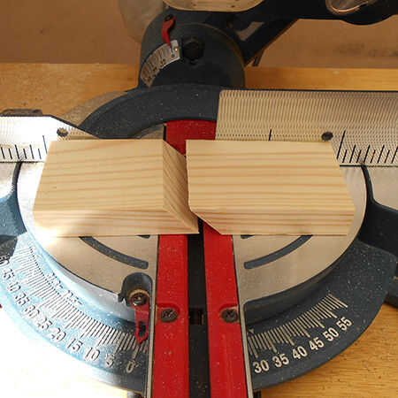 7. para montar el marco pesado en la pared que estoy usando el francés cornamusa sistema. Se trata de dos bloques de madera a cada lado, cada bloque por la mitad con un ángulo de 45 grados. Para esto usted necesitará una sierra de inglete compuesto o de vaivén con placa ajustable. Hacer los cortes del ángulo primero y luego cortar los bloques al tamaño. De esta manera no tienes que preocuparse de tener las manos demasiado cerca a la hoja para hacer los cortes en ángulo.