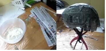 Usando sólo 1 tira a la vez, cubrir la tira en la mezcla de pegamento hasta visiblemente húmedo. Ejecutar los dedos abajo de la tira para eliminar suavemente cualquier grupos pesados de mezcla del pegamento. Aplicar la tira en la parte superior del casco de bici, poner la tira de la parte delantera del casco a la parte posterior del casco. Corte cualquier bit de la tira que cuelga de la parte posterior del casco y colocarlo paralelo a la primera tira. Repita sumergir las tiras en la mezcla del pegamento y colocación hacia delante hacia atrás en la parte superior del casco de la bici hasta que cubra la parte superior del casco.