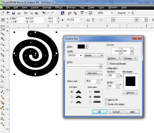 Cambiar el ancho de línea pulsando F12 y seleccionando "20 pt". Obviamente usted puede probar otros valores – y las espirales será más anchos, menos las espirales será más estrechas. Pt 20 es sobre el lugar donde las partes negro y blanco incluso.