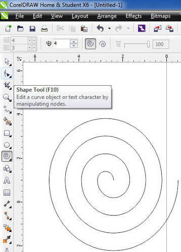 Seleccione la espiral y luego seleccione la herramienta forma (herramienta de 2ª de la tapa o F10). Ahora haga clic en cada segmento de línea que no desee y pulse Eliminar. Ajustado abajo a solamente 2 vueltas (con un poco de traslape para hacer 3) pero se puede hacer más o menos. También puedes agarrar los mangos poco con la herramienta y arrastre los segmentos en varias direcciones pero no lo que estamos haciendo hoy.