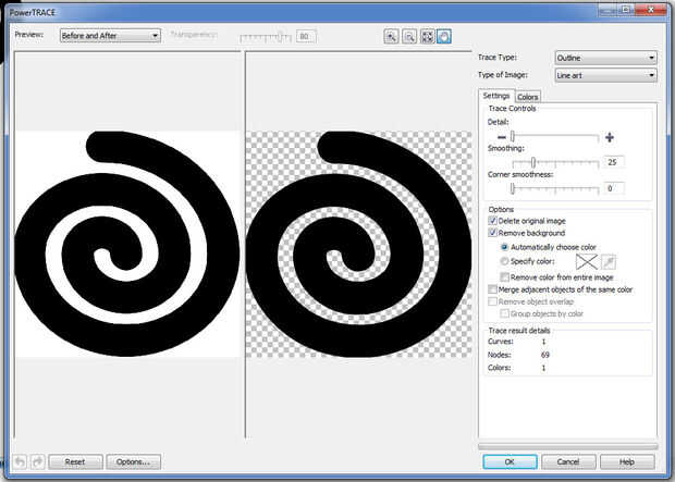 Seleccione el mapa de bits, haga clic derecho y seleccionar "contorno rastro -> Line art". En el cuadro de diálogo, seleccione "eliminar original" y "quitar fondo". Haga clic en Aceptar.