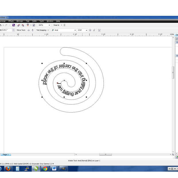 Seleccione el texto y luego haga clic en texto -> texto apto para ruta. Luego mueva el cursor sobre la espiral y se moverá el texto en la espiral. Toma un poco de posicionamiento cuidadoso para conseguirlo a donde usted lo desee. Movimiento single pixel puede cambiar radicalmente el resultado. Si no obtiene lo que quiere, trate de zoom más cercano y probar otra vez.