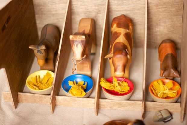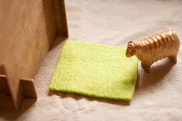 Utilice su imaginación para expandir el granero hacia fuera en la habitación! Cortamos nuestro un pequeño trozo de verde fieltro para el pastoreo de animales y tiene un pañuelo de seda azul que hizo un perfecto estanque para aves de madera pequeño. Dentro del granero que colocamos pequeños tazones de madera para comederos para cada animal en su puesto y utilizando hilo y fieltro amarillo hecho paquetes pequeños de heno para alimentos. Por último, he hecho mueble cercar de pollos o caballos para correr sobre exterior.