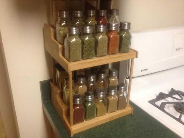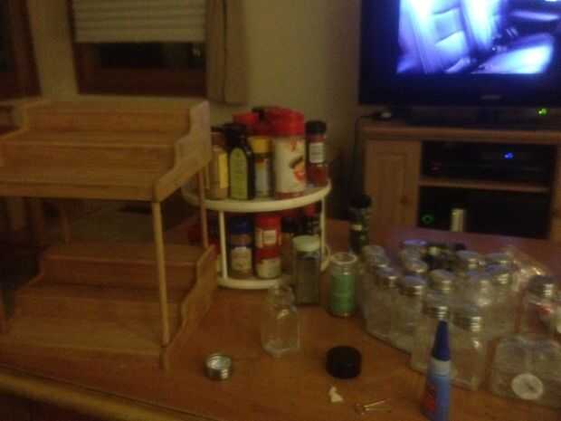 taladré agujeros para las espigas y luego después de aplicar un poco de pegamento, puse todas las piezas en su lugar. Mientras todo se secaba, comencé a vaciar todas mis especias en casas nuevas allí. Seguí algunos de los frascos de vidrio más agradables volver a utilizar. Guardo el polvo de chiles y el ajo en los grandes... Desde mi nuevo tarros de la especia tenían agujero los forrados con papel de aluminio. Yo volver y sello realmente algunos de ellos con masilla de silicona o algo, pero por otra que sea excesiva.