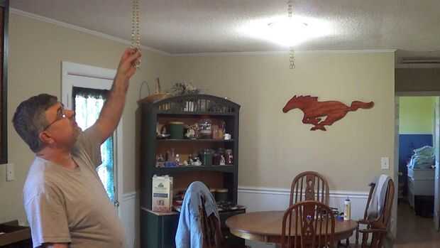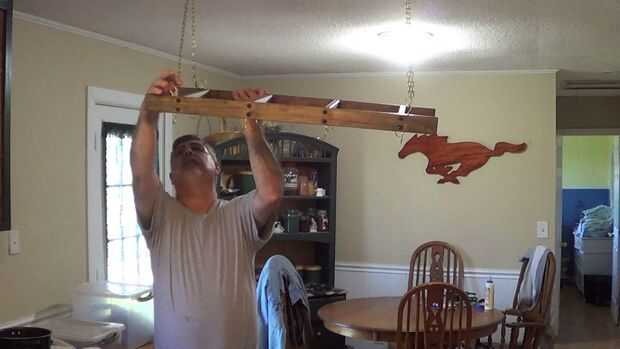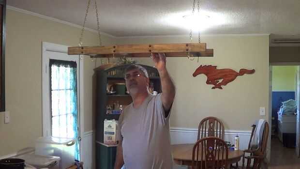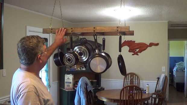 Ahora con la cadena colgando del techo, cuelgue su estante y poner tus ollas y sartenes en.