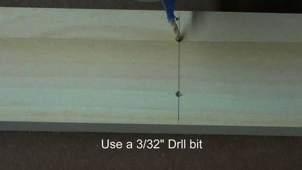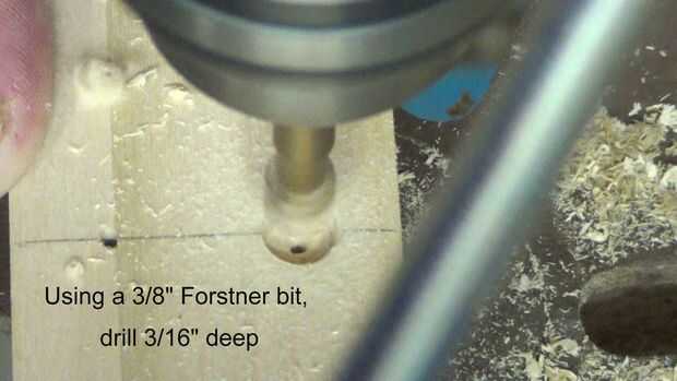 En el 36" largos rieles, donde sólo utilizamos un punzón. Tome un 3/32" pedacito de taladro y perforar a través de todo el camino. Entonces Búscate un 3/8" pieza Forstner y perfore 3/16" profundidad en los mismos lugares, como las fotos y el video.