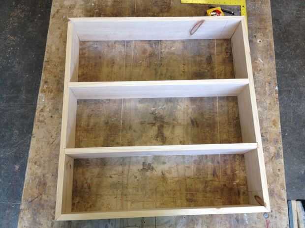 Este es el punto donde consiguieron peludas mi esquinas biseladas. Tomó un montón de tentaciones y putzing alrededor a los cartabones a uno con el otro, y al final uno de ellos es todavía un poco. Dice mi papá (trabajador madera "experto" que es) por eso los estantes a menudo no tienen esquinas biseladas. Para mi estante siguiente, esquinas rectas!