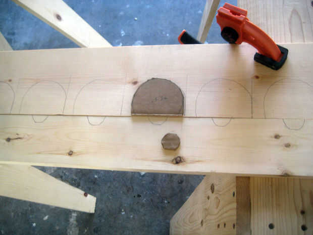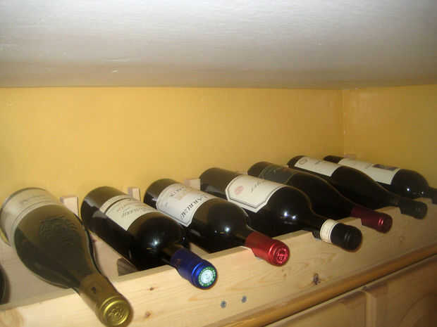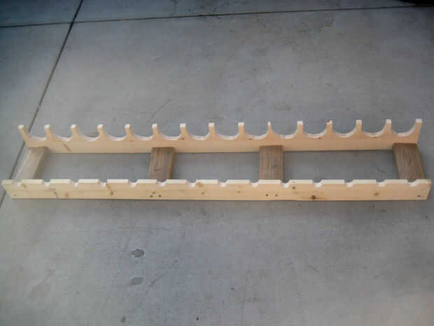 La rejilla es de sólo 5' de 1 x 4 y 5' de 1 x 6 con 2 x 4 refuerzo manteniéndolos juntos. Las muescas traseras se cortan con 3/4" entre ellos y son aproximadamente 3 1/2" de ancho que me da espacio para 14 botellas en sólo un pelo más 5' del armario. Hay suficiente espacio para dos filas de botellas allá arriba, pero yo no he decidido sobre la mejor manera de añadir una segunda capa sin embargo.