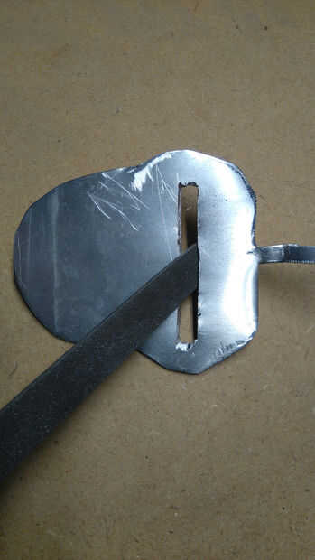 Utilice una lima para agrandar la abertura y convertirla en un rectángulo limpio agradable. Una vez que haya suficiente espacio, el lado opuesto a la manija para hacer una hoja del archivo. El ángulo puede ser determinado por ensayo y error, pero he encontrado que a mi me funciono un ángulo de 45 grados.