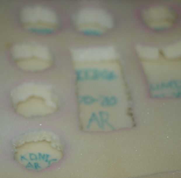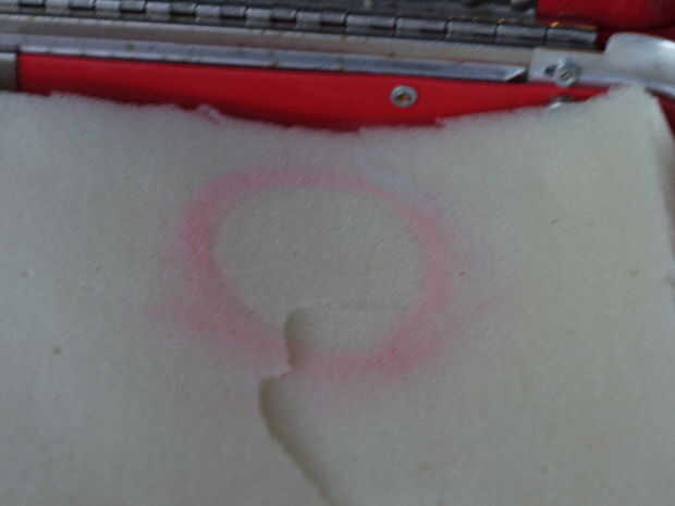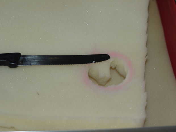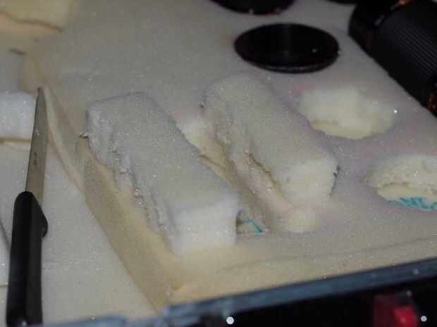 Otra vez cortar algunos espuma tamaño y luego marcar las áreas a cortar para su equipo. NO adhiera esta capa, de esta manera si desea agregar más cambios todo lo que tienes que hacer es quitar y cortar una nueva sección. Usando un cuchillo para cortar funciona mejor! Si desea, puede utilizar un marcador para cada sección de la etiqueta. Añadir poco extra de espuma para los objetos más altos.