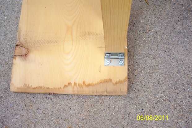 Todo lo que necesitaba para hacer este soporte era unos trozos de madera, tres para ser exactos. Dos piezas de 1 x 2 y una pieza base, cualquier cosa disponible, sobre 10 pulg. x 20 o asi. Para hardware, usé un perno, 5/16 x 4 en, una bisagra de la carcasa (ver fotos), una pieza de conducto de 18 pulg de largo, unos pernos para asegurar el conducto a los trozos de madera y un tornillo para el uno en posición vertical que es inmóvil.