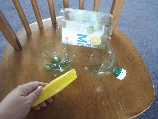 Recoger una botella de soda vacía. Corte la parte superior e inferior de la botella con la etiqueta como su guía. Corte vertical a lo largo de la costura de la etiqueta. Han transformado su pedazo de cilindro de plástico en una hoja que mide cerca de 13 "x 6".