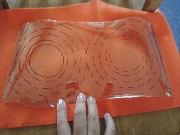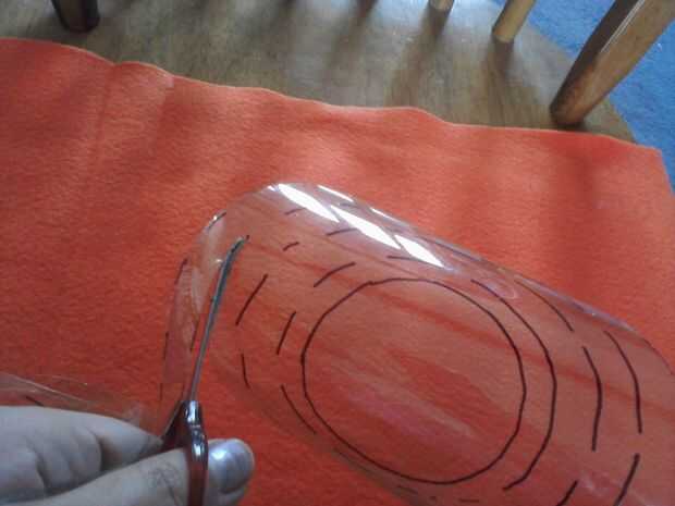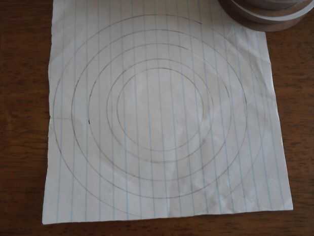 En un pedazo de papel Utilice la brújula para dibujar una serie de radio de 1 1/4", 1 1/2", 2", 2 1/2", 3". Use su marcador permanente para trazar los círculos en su nueva hoja de plástico. Después de haber dibujado los círculos por un lado, deslice el papel hacia el otro lado y sacar el resto de los círculos. El objetivo es hacer un camino continuo para el centro en el extremo opuesto.