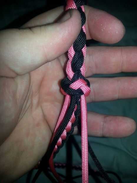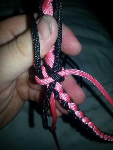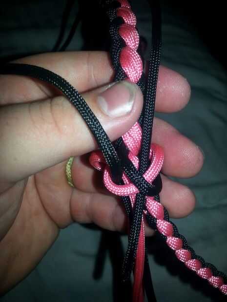 4) ahora, aquí está la parte difícil. iniciar en cualquier hilo y lazo hacia fuera sobre y detrás de la cadena del mismo color como se muestra en los cuadros 6-9. Ahora apriete el nudo lo mejor posible y de forma que así mantenerlo uniforme en forma y aspecto. el nudo de diamante nunca fue diseñado para ser utilizado como un nudo de tope de la cuatro cadena en una trenza posterior con una base de cuerda a través de él. por lo que no pocas veces. no biggie, solo intento e inténtelo de nuevo.