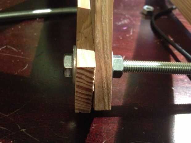 Tomar un perno y una arandela y luego 2 listones, otra arandela y una tuerca y armar. No apriete todavía como usted necesita tener un margen de ajuste. Hacia el otro extremo de uno de los listones y repita el proceso. Hacia el final de uno de los tornillos y rosca en una tuerca un poco más de una pulgada sobre el perno. Añadir una arandela 2 listones, otra arandela y otra tuerca.