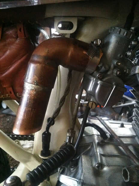 Para conseguir que se conecte al carburador, creé unos 15 cortes de 'corte' en el extremo del carburador de la tubería de cobre y usa una abrazadera para ajuste en la boca del carburador. Para medida adicional un poco envuelve el carburador de apertura con algunas ante que había en tenía que actuar como una junta entre la boca del carburador y el tubo de cobre.
