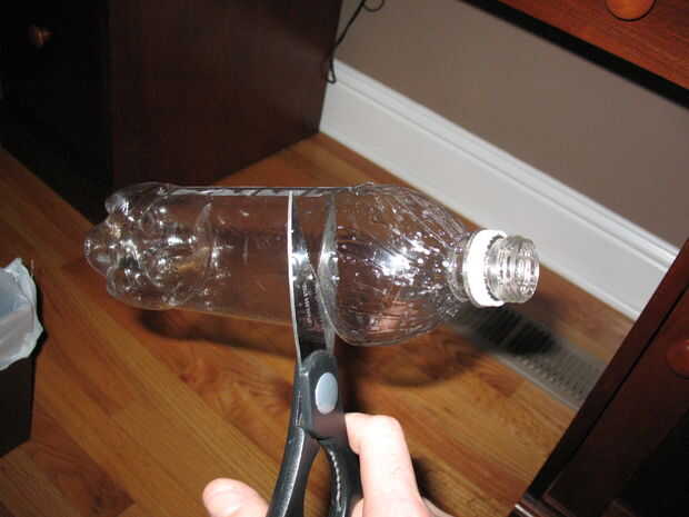 Jab la tijera por el lado de una botella de refresco limpia transparente de plástico. No jab de mano. Comience cortando la parte superior. Probar y hacer un bonito corte recto así que impresionarán a tus amigos con tu habilidad de tijeras.