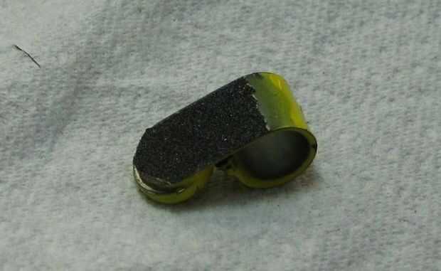 Por último, porque el plástico es slick y el peso del tubo al lado, si lo dejaste solo el vaso de tubo rotarían en el imán. Esto no es bueno. Tomar un pequeño trozo de papel de lija y pegamento con cola blanca (o el pegamento de su elección, no tiene que ser las cosas super fuerte) a la parte inferior de la abrazadera del cable de plástico. Esto actúa como una superficie de fricción para que no gire el vaso en la nevera.