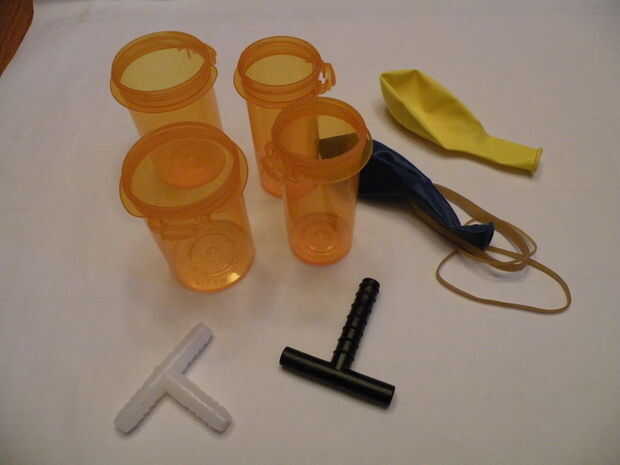 Bandas de goma, globos de látex, tuberías de plástico "t" (de Lowes, Home Depot, Menards, sobre $2,00), botellas de la píldora con receta