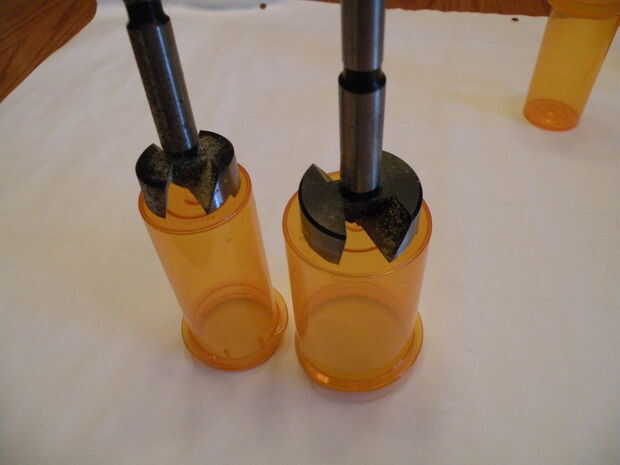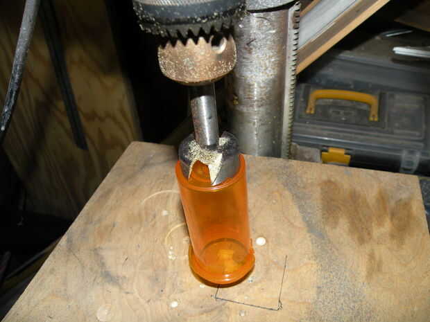 Taladrar un agujero en el fondo de cada botella. El tubo interior debe encajar perfectamente en el tubo exterior. En nuestro ejemplo, la botella exterior utiliza una pieza Forstner de 1 y 1/2" y la botella interna utiliza una broca de 1 y 1/4". El tamaño del agujero en la botella interna no es crítico. Se calafatear el ajuste entre las botellas interiores y exteriores, así que usted tiene un pequeño margen de maniobra, pero en nuestro ejemplo se ajustan como un guante!