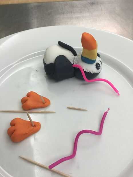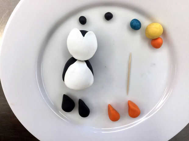 - Con su palillo separar los pies del puffin, usted puede empujar en formas ligeramente bulbosa del dedo del pie. Romper un palillo por la mitad a utilizar para unir las patas al cuerpo