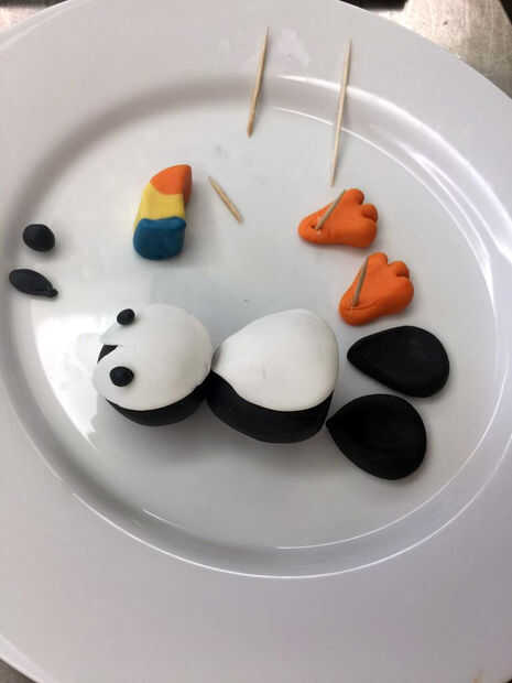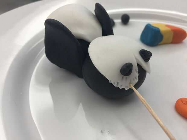 - Fijar la cabeza al cuerpo colocando un palillo en el medio de ambos y humedecer ligeramente las áreas donde las dos redondas conectan.