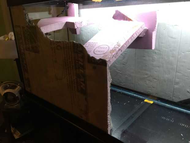 Es importante crear un buen sello para el vidrio. Usted no quiere cualquier pez nuevo llegar. Kuhli lochas, estoy hablando a usted! Utilizar un montón de silicona para adherir al fondo a la pared del tanque. Apoyo el fondo con espuma mientras que cura. Dejar curar durante la noche.