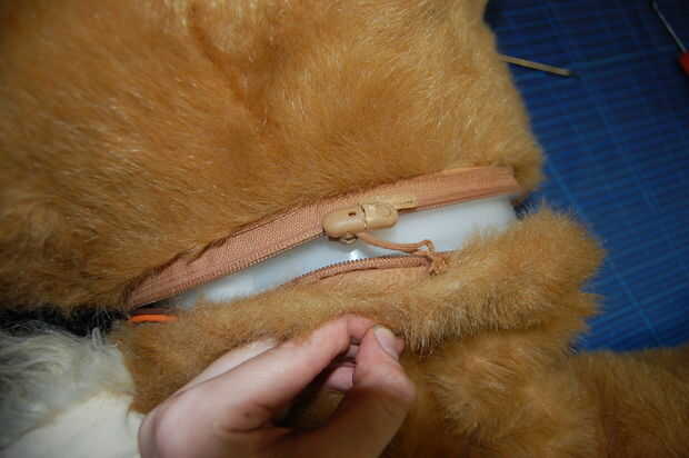 Antes de entrar en la divertida piezas, necesita a la piel de su caballo.   Comencé en la cabeza como ya tiene una cremallera.  Mover la melena fuera del camino y coloque la cremallera en la base del cuello.  Usted encontrará que el tirón de la cremallera tiene una tapa encima para evitar que descomprimir.   Simplemente romper este cap y descomprimir la piel de alrededor de la cabeza.