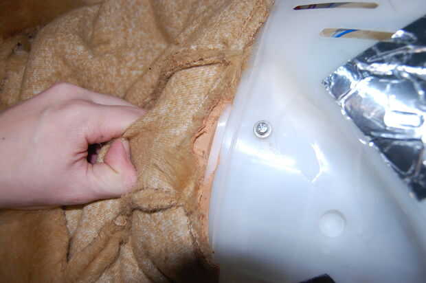 El último paso es para eliminar la parte que sujeta la tela hasta el cuello.  Lo hice por el corte a través del tejido más ligero, menos de la piel en el cuello.  Después me lo quitaron, me encontré con que se celebró por una amarra dentro de ese lazo de tela.  Lo puedes hacer mi camino, o puede introducir el cortador de alambre de la tela en la siesta del cuello y simplemente corte el cordón grande.  Esto debería permitirle retirar totalmente la piel.