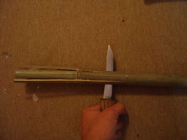 4. Coloque la hoja de su cuchillo a lo largo de la primera serie de marcas que usted dibujó. Dar la parte de atrás de la hoja un golpe firme con la palma de la mano para dividir el bambú. Split sólo unas 6 pulgadas hacia abajo, y el primer nudillo que usted venir a través. Hacer esto tres veces más hasta que todas las fracturas se han iniciado. Ahora comience a correr el cuchillo hacia abajo de cada par de fracturas, las fracturas más abajo hacia la empuñadura de conducción. Y a todos, en lugar de una división hasta la cinta a la vez, que va a salir mucho más aún de esta manera.