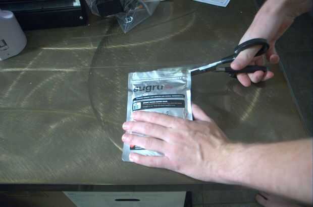 A continuación, mantenga las tijeras en una mano, mientras simultáneamente agarre el paquete de sugru en otra parte. Use las tijeras de la manera normal de cortar la parte superior del paquete sugru, teniendo cuidado de no cortar por debajo de la cerradura de zip resellable tira cosita. Aunque, para ser honesto, si ocurre accidentalmente cortar a través de la cerradura de zip resellable tira cosita a pesar de mi advertencia, usted no es realmente el fin del mundo, como veremos en pocos pasos.
