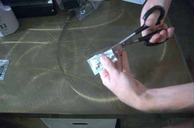 Una vez más tomar las tijeras y proceder a cortar a lo largo de los bordes exteriores del paquete sugru, como se indica por las líneas punteadas hábilmente colocadas.