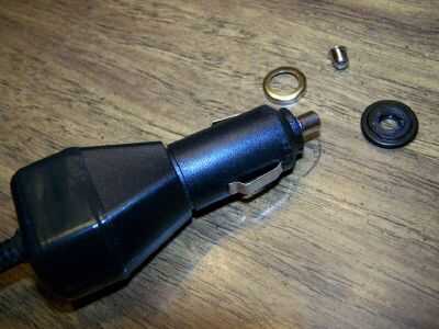 Hay algunos repuestos de sobra, pero el convertidor de corriente ahora confiablemente funciona otra vez. La punta metálica que anteriormente hicieron contacto con la punta del centro del encendedor de cigarrillos ha sido reemplazado por el extremo del fusible visible en la foto. Todavía hay una acción del resorte en el fusible por lo se presiona en el zócalo.
