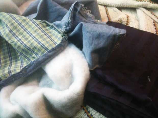 Mi primer paso fue desmontar la colcha y ver lo que estaba trabajando con. La capa exterior era un Damasco rayas púrpura. En el interior era un aciano azul tela y un plaid verde/azul que fue especie de acolchado con una capa de guata en el medio.