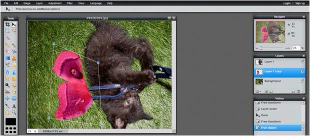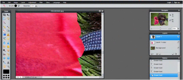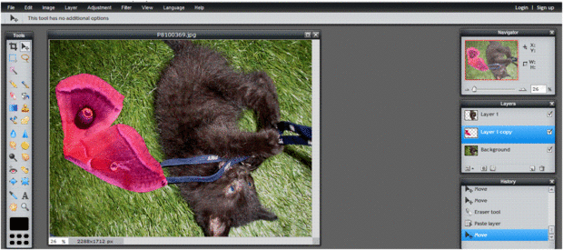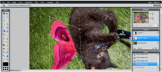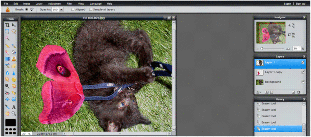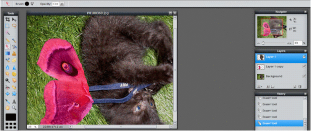 Antes de transformar el ala, que desea eliminar de fondo en la capa superior del gatito. Haga click en el gatito en el cuadro de capas y luego usar la herramienta Borrador para borrar la hierba. Usted comenzará a ver más del ala.