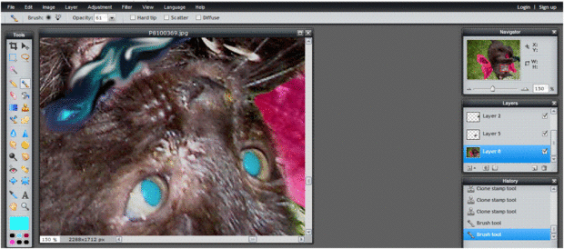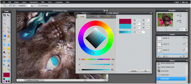 Toma la herramienta pincel y en la zona de opciones del pincel situada en la parte superior, cambiar su opacidad a menos del 100% dependiendo de cuánto del ojo original que desea mantener. También cambiar su tamaño para que quepan en el ojo. Para cambiar el click de Color en los cuadrados de color y una nueva pantalla aparecerá. Esto le permitirá elegir su color y luego usted puede cepillar el color de los ojos en.