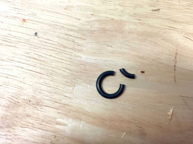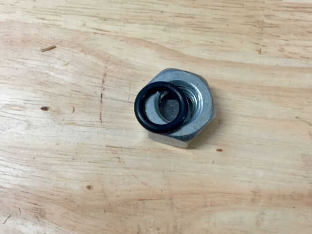 Próximo que necesitaba para asegurarse de que el contenedor era impermeable. He encontrado el anillo de O más pequeño que pude, que resultó para ser demasiado grande para caber dentro de la tuerca. Corté una pequeña sección de la junta tórica, que me permitió caber dentro de la tuerca, duro contra la parte inferior. Esperaba una vez que la sección larga del perno era jodida que esto haría que el impermeable toda la cosa.