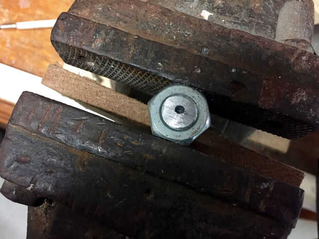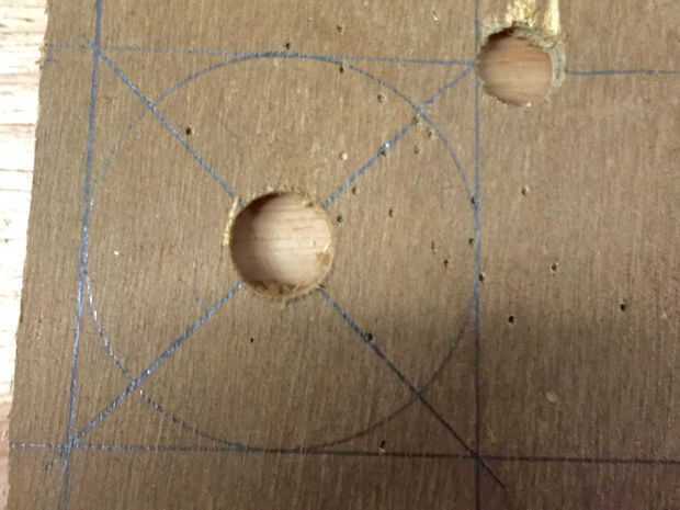 Para el agujero más grande posible iba a ser necesario encontrar el centro del perno. Después de un poco de rascarse cabeza acabé haciendo un vaivén rápido usando un trozo de madera contrachapada. Primero marcó un cuadrado y dibujar en las diagonales. Luego perforé un agujero del mismo diámetro como mi perno en el punto donde se cruzaron las diagonales. Entonces fui capaz de atornillar el tornillo en el agujero y marque las diagonales en el perno, que terminó siendo casi perfectamente en el centro.