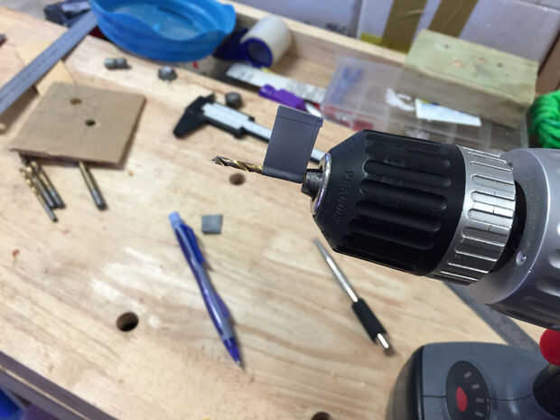 Después de haber perforado el orificio piloto, luego perforar el agujero más grande en incrementos, con 4mm, 5mm, 6mm, 7mm y finalmente 8mm Brocas de taladro. Agrandando el agujero era mucho más rápido que el piloto taladrado, y pronto tenía el agujero del diámetro correcto. Comprobar la profundidad de mi agujero y optó por perforar marginalmente más de mi inicial 15mm, teniendo cuidado de no perforar demasiado (un error que hice en mi primer intento en este...).