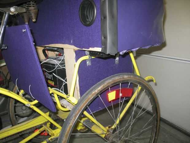 Hicimos una base para el sistema de altavoces todo para sentarse en la cama del triciclo, nuestra base también incluye un lugar para nuestra batería más grande. La primera foto en esta sección.