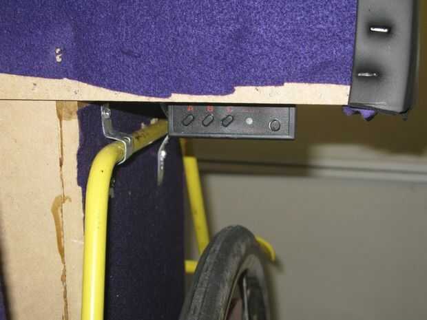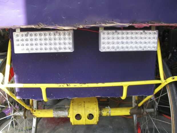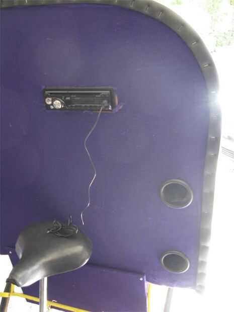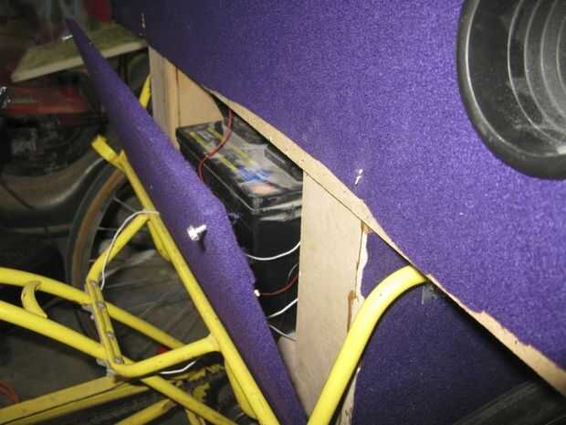 Añadimos la púrpura fieltro con spray de pegamento y hecho los bordes de la misma mirada agradable con una cosa de cierre de puerta de goma. Engrapar el revestimiento plástico sobre la tela y hemos tenido que utilizar dos de parte de epoxy para el otro lado porque el bondo y fibra de vidrio son dos fuertes para las grapas. También tuvimos que añadir sentido a todas las partes de madera que se ven en el soporte de caja de altavoz. Nos gustó el aspecto de soporte de caja de la batería así que agarré unos restos de madera y cortarlo y había añadido fieltro y atornilladas en el ghettoblaster. Para conseguir la batería que sólo Desatornillar el panel. Teníamos un conjunto de paneles led con 50 leds en cada uno de rojo y azul. Atornilla las luces en la parte trasera de la moto y corrió el cableado por el interior de la caja del altavoz en la parte frontal izquierda de la moto fueron el regulador para las luces. Esperemos que esto le ayudará si usted quiere hacer algo como esto, por favor, comentario o mensaje me si usted tiene alguna pregunta. También si desea información actualizada sobre la bicicleta ir a [http://ghettoblasterinc GhettoBlasterINC.com]