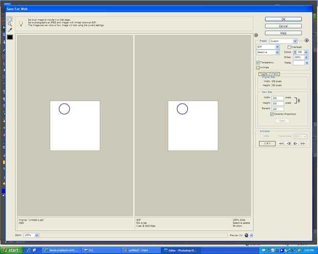 ahora haga clic en archivo + guardar para web y haga clic en animar. luego vaya al cuadro de animación y seleccione el menor retardo de marco, thejn haga clic en aceptar, seleccione su destino y el nombre y haga clic en guardar.