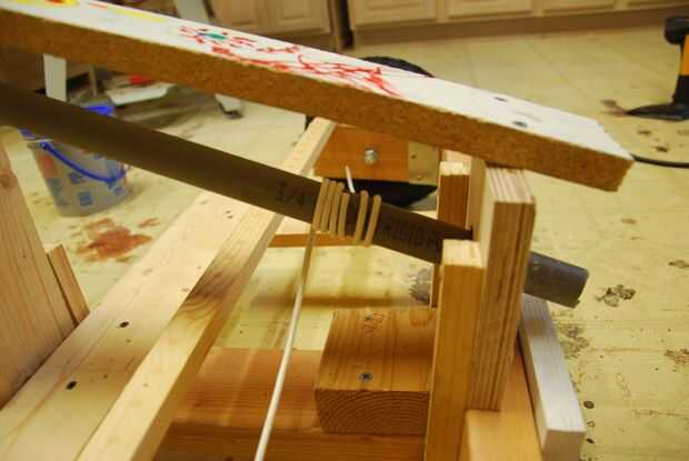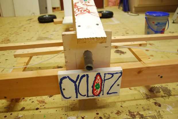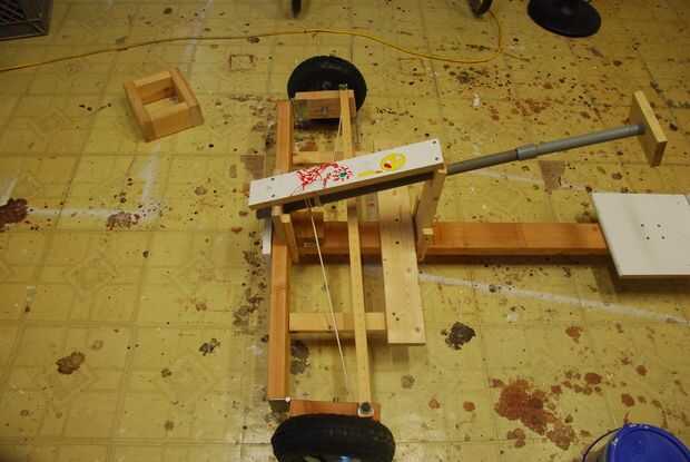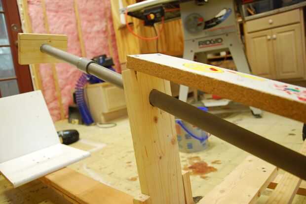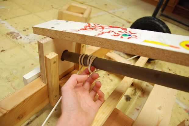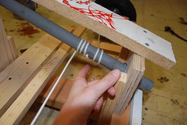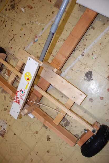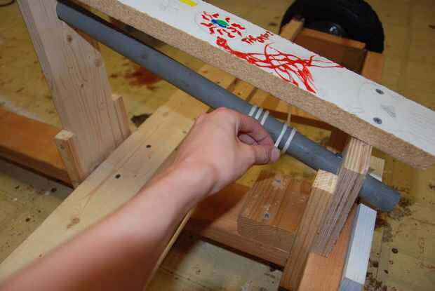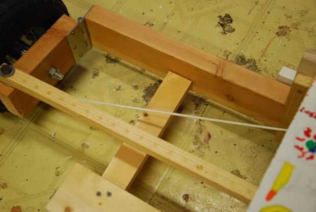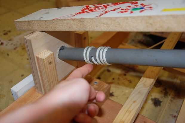 Para el manejo dan unos 2 por 4 y cortar 3 piezas, una de 40 pulgadas de largo (3' 4") y dos piezas 7 pulgadas de largo. Tomar siguiente usted puerta bisagras y montar a cada lado de los 2 más de largo por 4, luego conectarlos en los pedazos más pequeños de 2 por 4. A continuación tome una longitud de madera de desecho que es suficiente para conectar los pedazos más pequeños y perfore un agujero de 3/8 de pulgada en ambos extremos. Luego perfore un agujero de 3/8 de pulgada en los extremos de ambos trozos pequeños de 2 por 4. A continuación inserte los pernos de 3/8 de pulgada por todos los orificios y atornille en su lugar. Para estos pasos, necesita mirar las fotos de referencia ya que es difícil de explicar. Perfore un pequeño agujero en la parte inferior de cada uno de los pedazos más pequeños de 2 por 4 lo suficientemente grande como para caber el paracord a través. El paracord a través del hilo de rosca y un nudo en el extremo. Ahora se refieren a las imágenes de cómo hacer los siguientes pasos. Después de haber completado estos pasos montar el mecanismo de dirección en el cuerpo. Para el volante tomé un trozo de madera y perforar un agujero de 3/4" en el centro con un taladro, luego con un mazo golpea sobre el tubo de PVC. Usted podría hacer lo que quieras para el volante mientras trabaja.