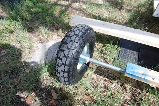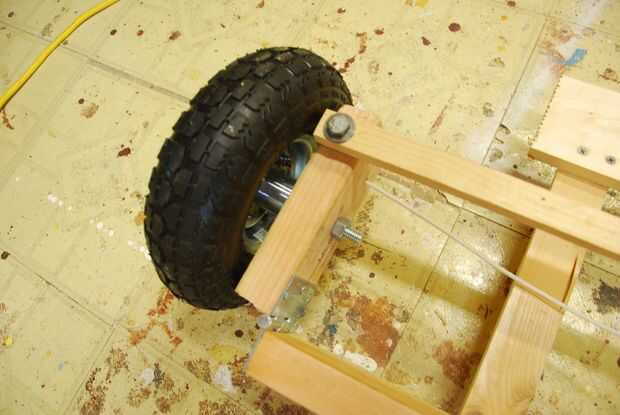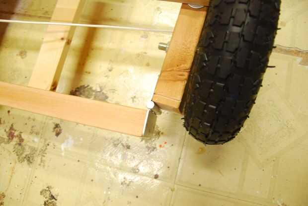 Para el taladro de las ruedas delanteras dos agujeros de 1/2 pulgada en las dos piezas pequeñas de 2 por 4 en la dirección, asegúrese de que estos agujeros se encuentran en el medio. Luego tomar la 2 ruedas y línea para arriba con los agujeros solo perforar y colocar la 1/2" perno y asegúrelo con una tuerca hexagonal. Para las ruedas traseras tomar la varilla de 5/8" y fijarlo a la parte posterior con la cinta de fontaneros. A continuación tomar 2 Tornillo collares y colóquese en el lado de la cinta de fontaneros. Siguiente tomar dos collares de tornillo ponerlos a ambos lados de la barra, luego poner las ruedas y poner en la barra. Entonces puso un collar de tornillo en el extremo de la varilla apriétela hacia abajo.