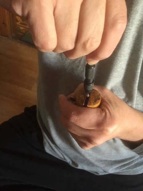 Luego perforar el grano. Utiliza una broca pequeña en un vicio de pin y el grano en graciosamente llamado abrazadera de anillo tornillo inferior.