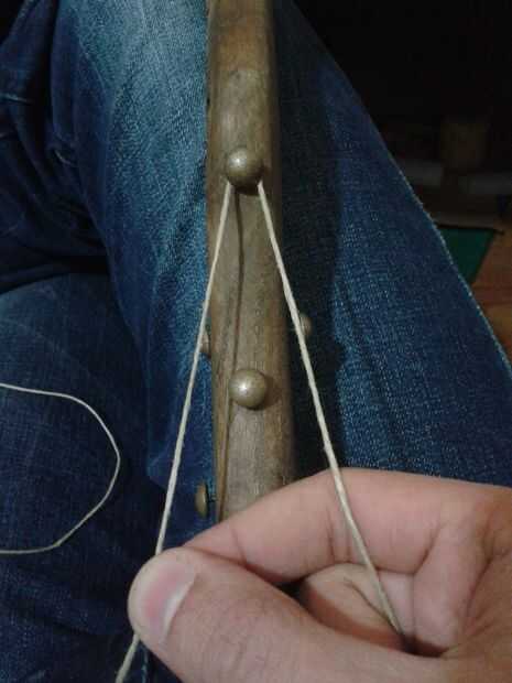 - Empezar a tirar las cuerdas firmemente, no necesita un afloje uno, pasando de una a otra, las dos cadenas iguales se enganchará en los pines por lo que necesitará trabajar firmemente, debe pasar la cuerda por debajo de los pernos y apriete bien que pueden martillo cada pin que empresas de la cadena para bien