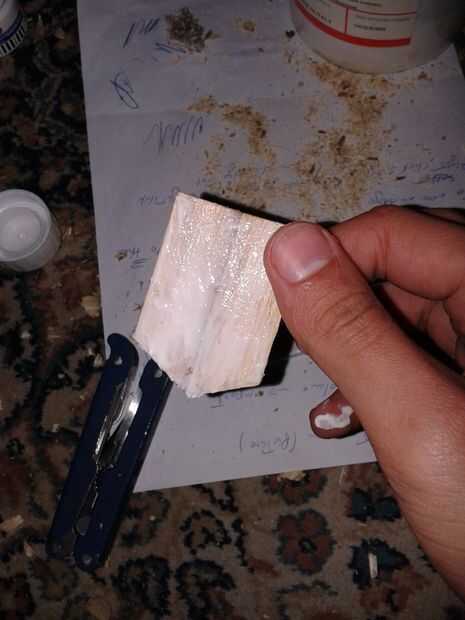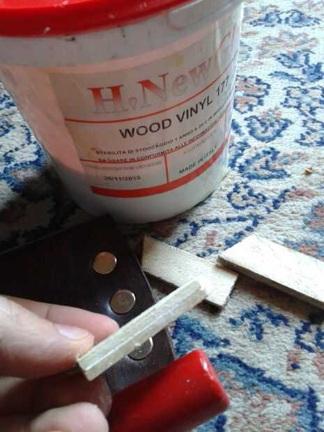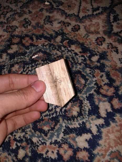 - Encontré estas virutas de madera que viene con la lona, la madera es suave, así que pensé que tal vez, si bien martillado, tomará la forma de ese ojo, pegue dos chips con un vynyl madera para hacer grueso