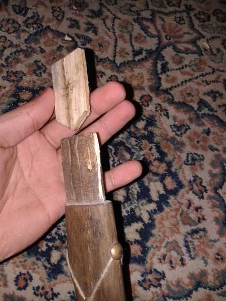 - Tallar la cuña para que el extremo puntiagudo es más delgado que la parte superior, tomando una forma de v. vio el mango por la mitad donde se ajuste la cuña.