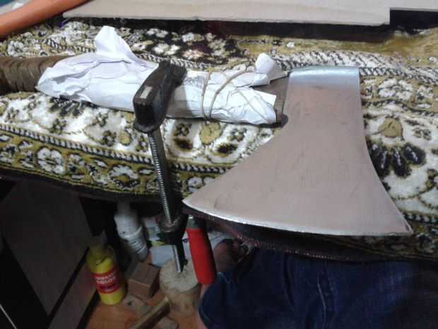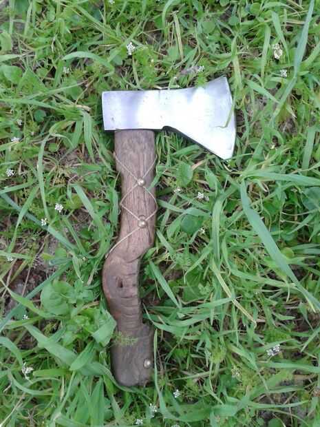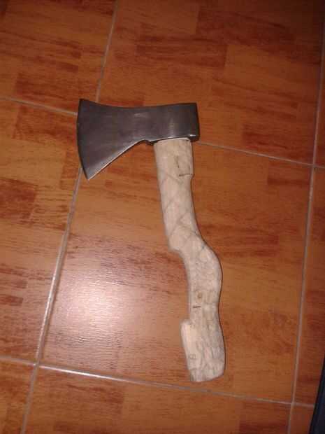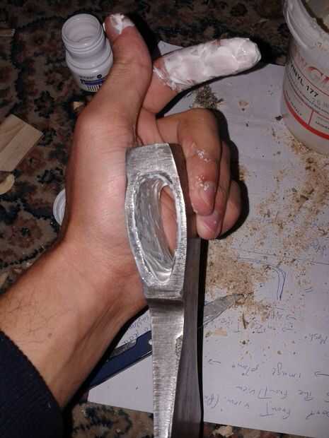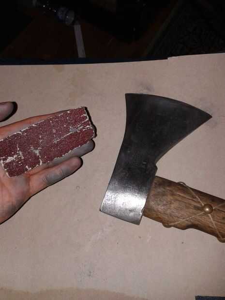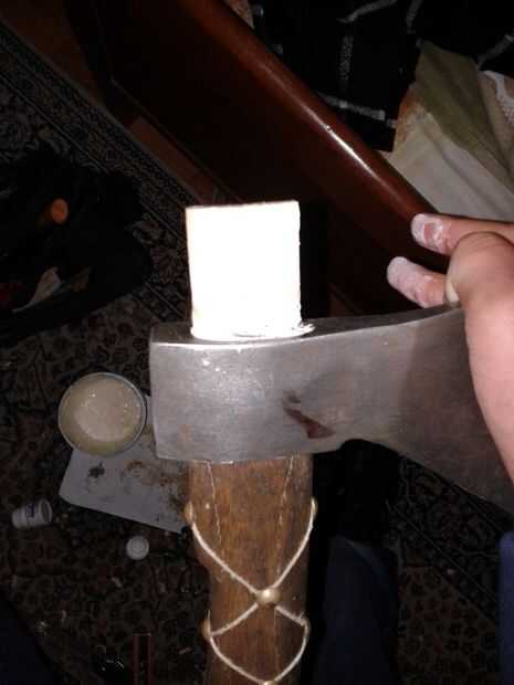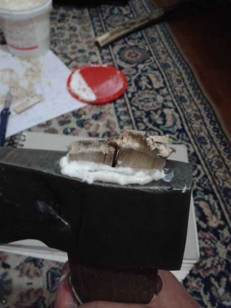 En el segundo paso lijar el mango para el hacha fácilmente, en lugar de dejarlo en el mismo tamaño que el ojo del hacha y entonces martilla firmemente, por lo que he comed para arriba con una solución para este error, vea cómo restaurar un hacha por un profesional mire este video, me ayudó mucho.
